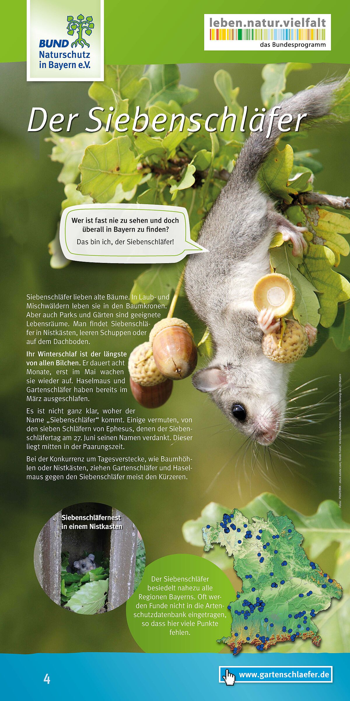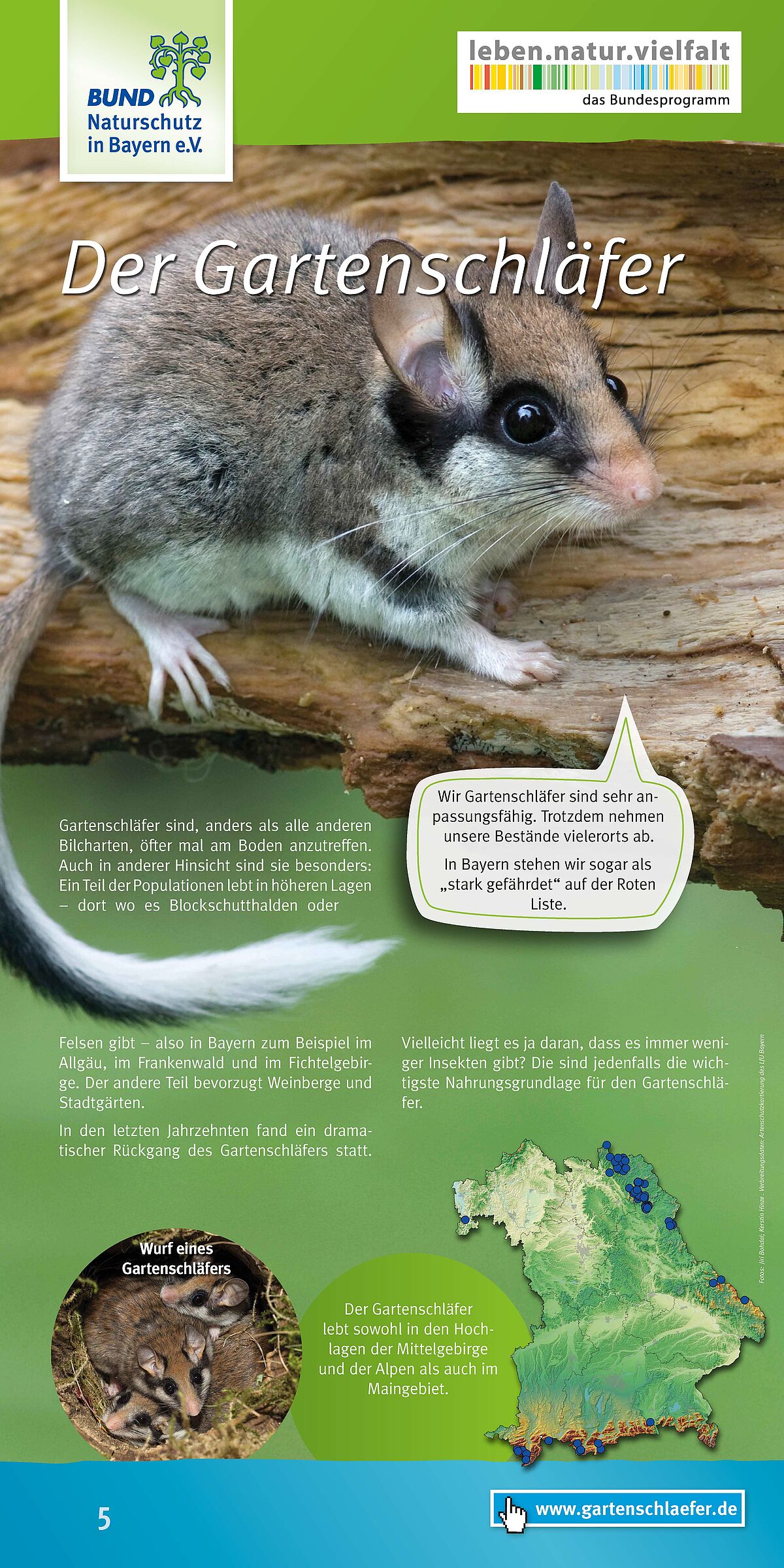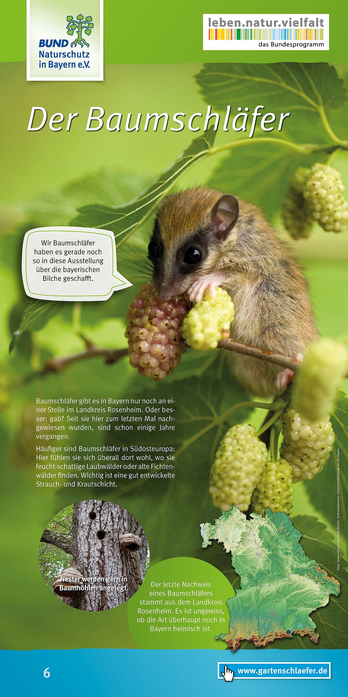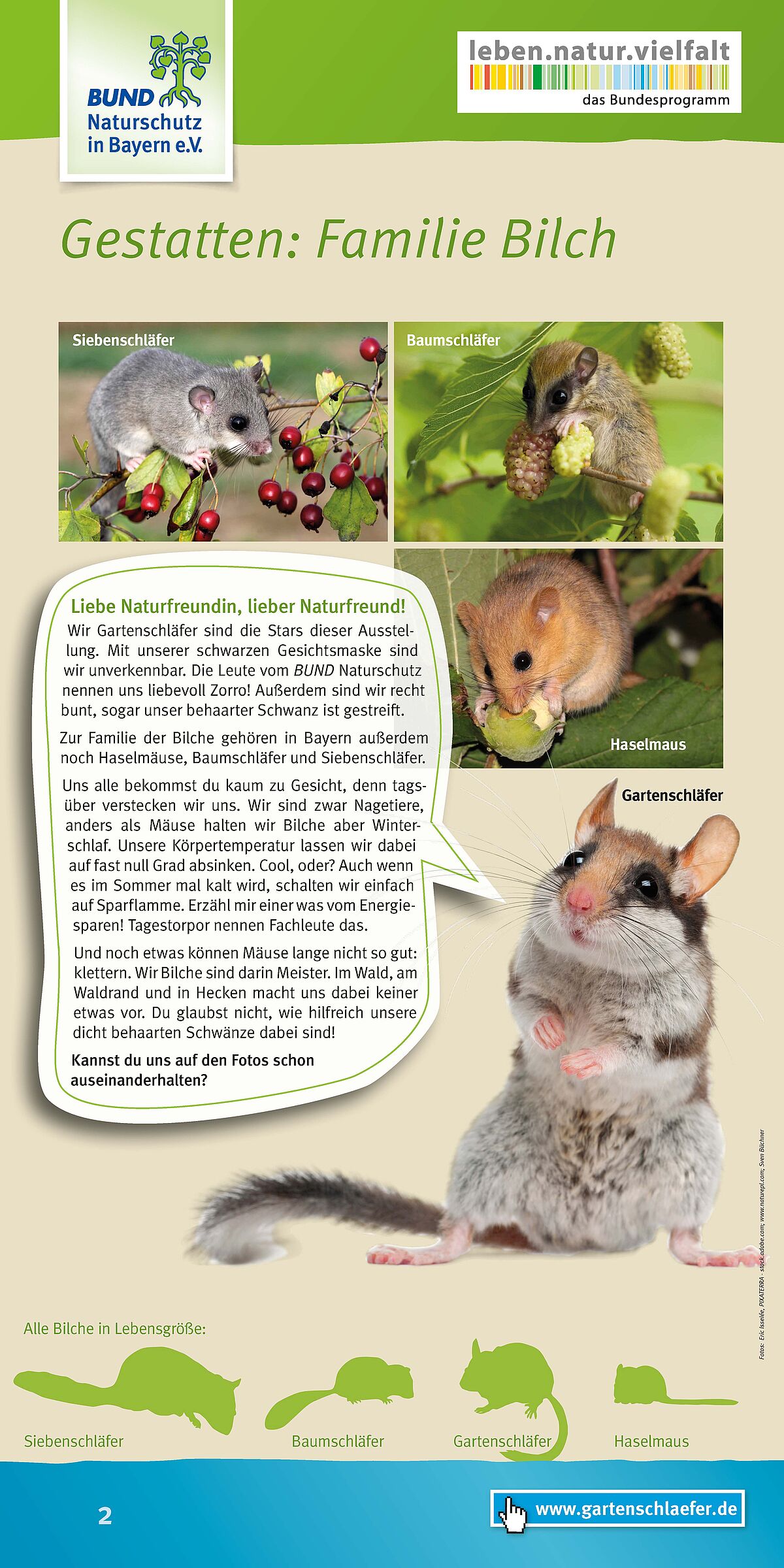 Als kleine freche Kobolde huschen sie oft unbemerkt durch die Nacht. Um ihnen auf die Schliche zu kommen und mehr über ihre Lebensräume, ihre Gefährdung und ihren Schutz zu erfahren, führt der BUND Naturschutz, weitere BUND-Landesverbände und die Justus-Liebig-Universität Gießen und die Senckenberg Gesellschaft für Naturforschung seit 2018 das deutschlandweite Naturschutz-Großprojekt "Spurensuche Gartenschläfer" durch. Viel interessantes über die Lebensweise der Bilche und wie es um den kleinen Kerl mit der Zorromaske und die anderen Bilche steht, erfahren Sie in dieser Ausstellung.