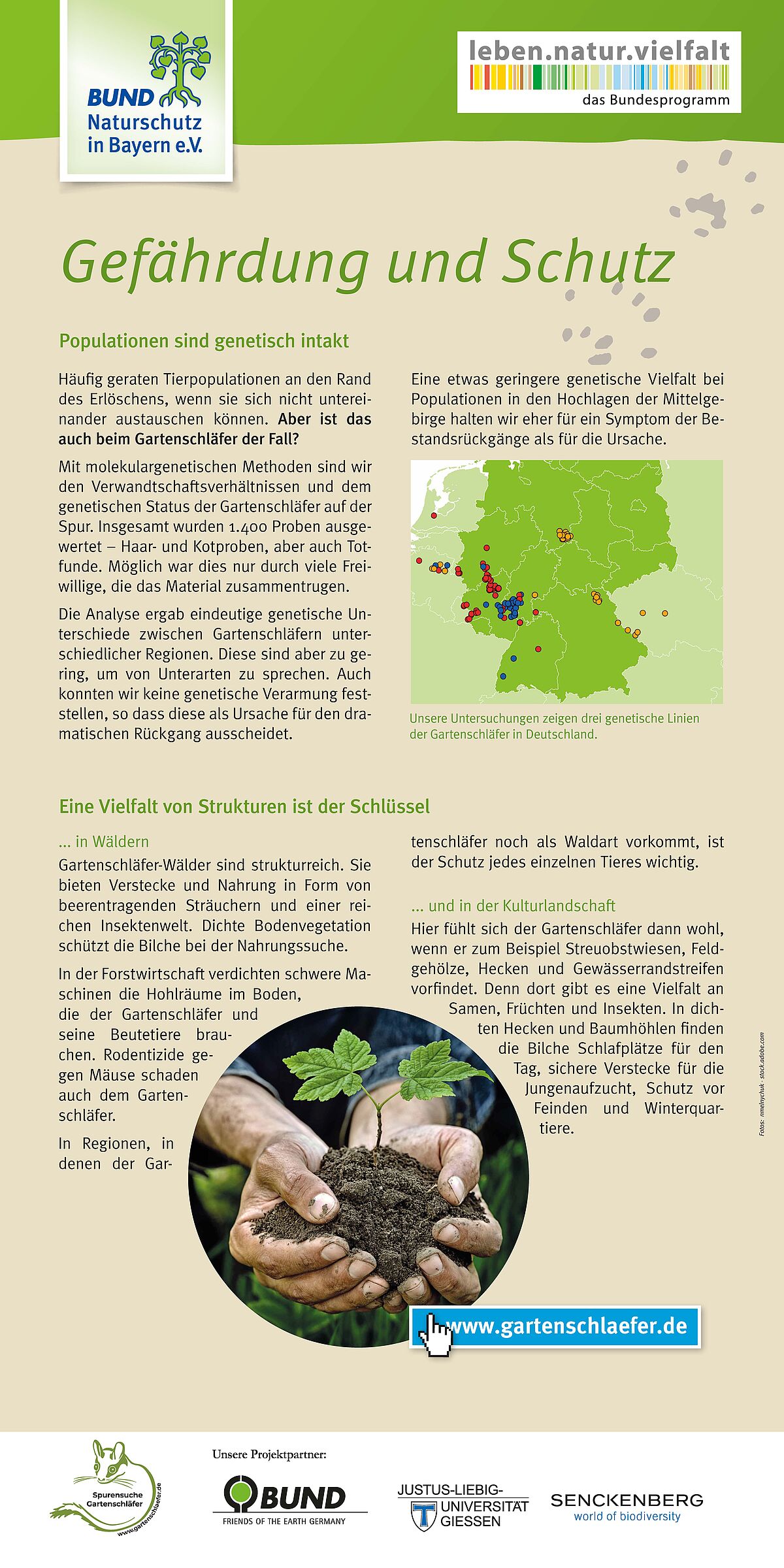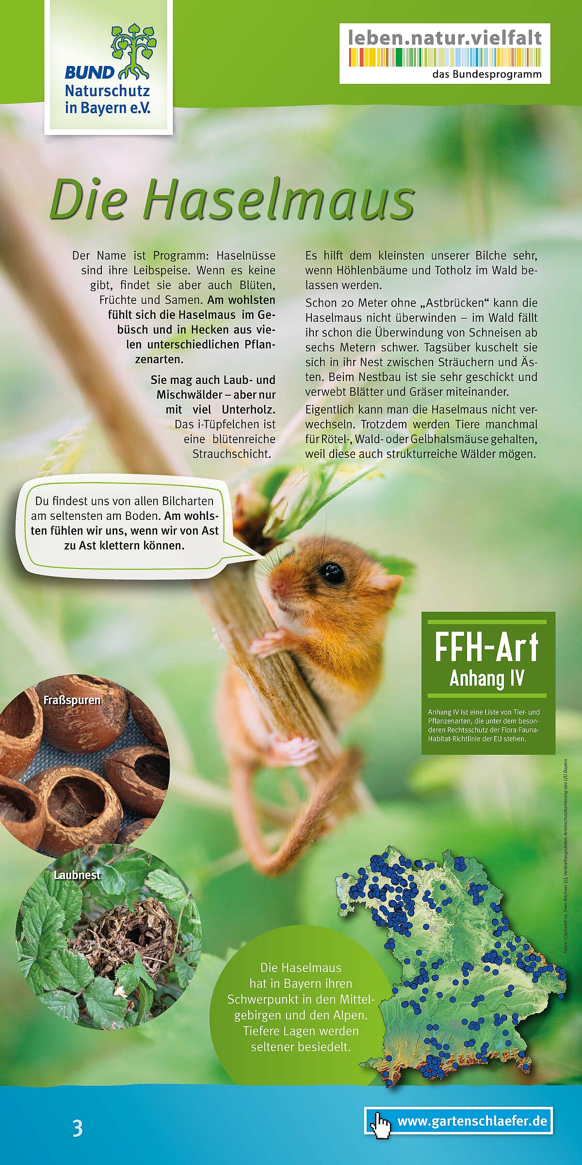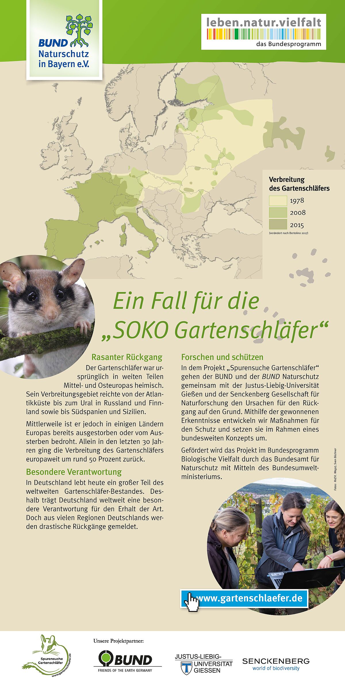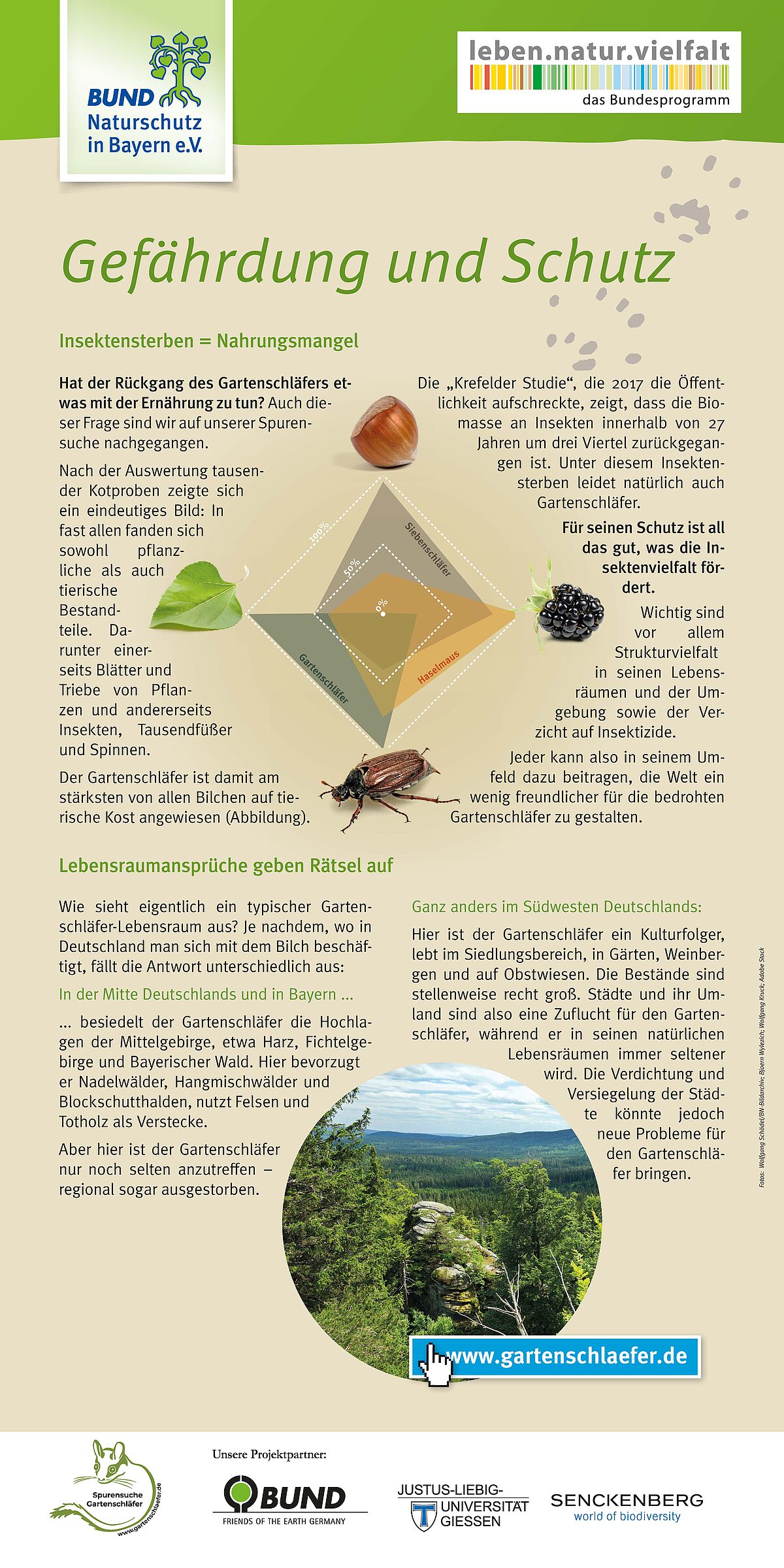 Als kleine freche Kobolde huschen sie oft unbemerkt durch die Nacht. Um ihnen auf die Schliche zu kommen und mehr über ihre Lebensräume, ihre Gefährdung und ihren Schutz zu erfahren, führt der BUND Naturschutz, weitere BUND-Landesverbände und die Justus-Liebig-Universität Gießen und die Senckenberg Gesellschaft für Naturforschung seit 2018 das deutschlandweite Naturschutz-Großprojekt "Spurensuche Gartenschläfer" durch. Viel interessantes über die Lebensweise der Bilche und wie es um den kleinen Kerl mit der Zorromaske und die anderen Bilche steht, erfahren Sie in dieser Ausstellung.
