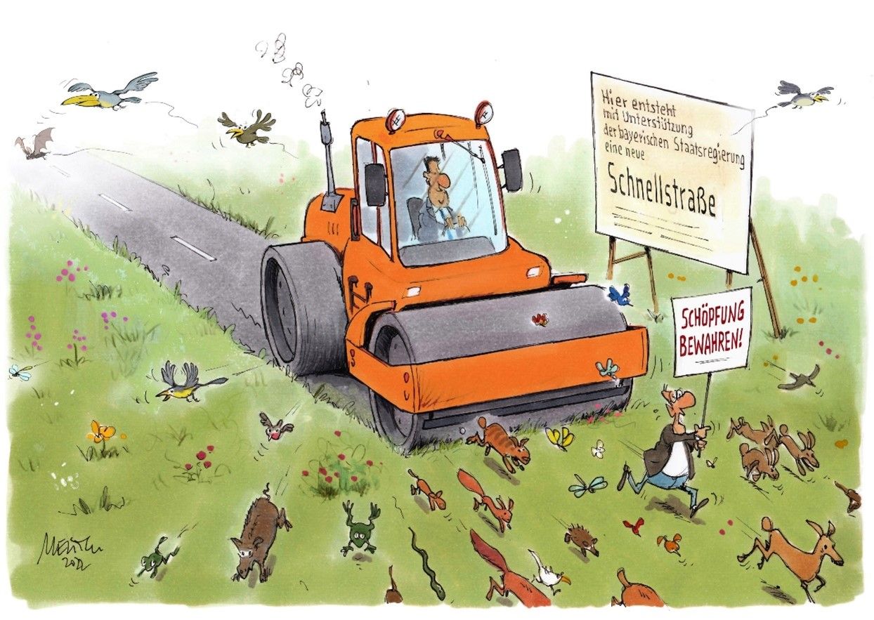 Der Flächenfraß in Form von Neubaugebieten, Fernstraßen und Industriegebieten zerstört unsere Lebensgrundlagen. Mit den Karikaturen von Gerhard Mester bringt die Ausstellung das Thema Flächenverbrauch auf den Punkt und zeigt die Forderungen für einen effektiven Flächenschutz auf.