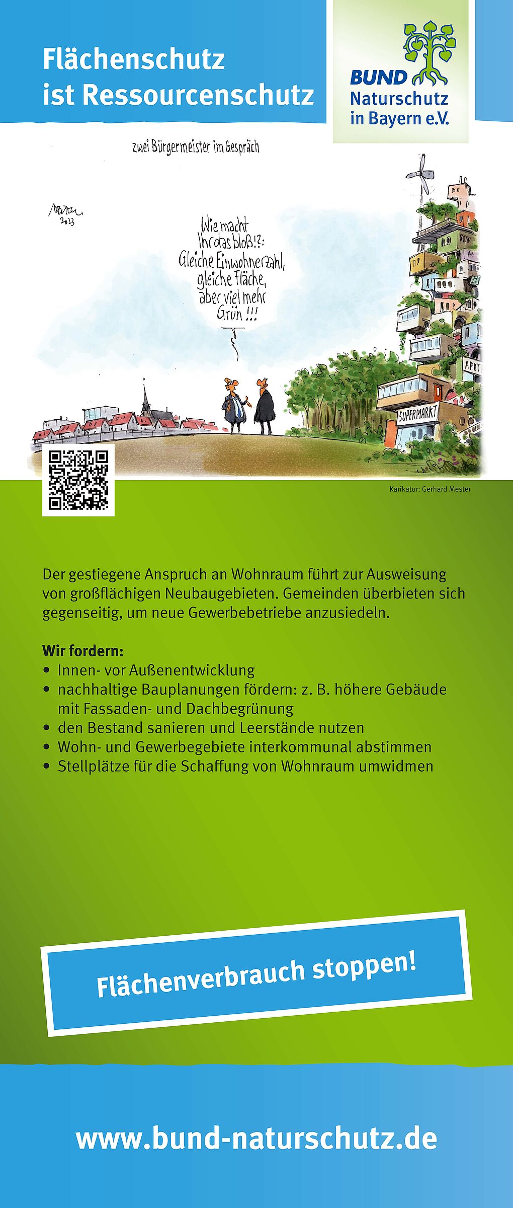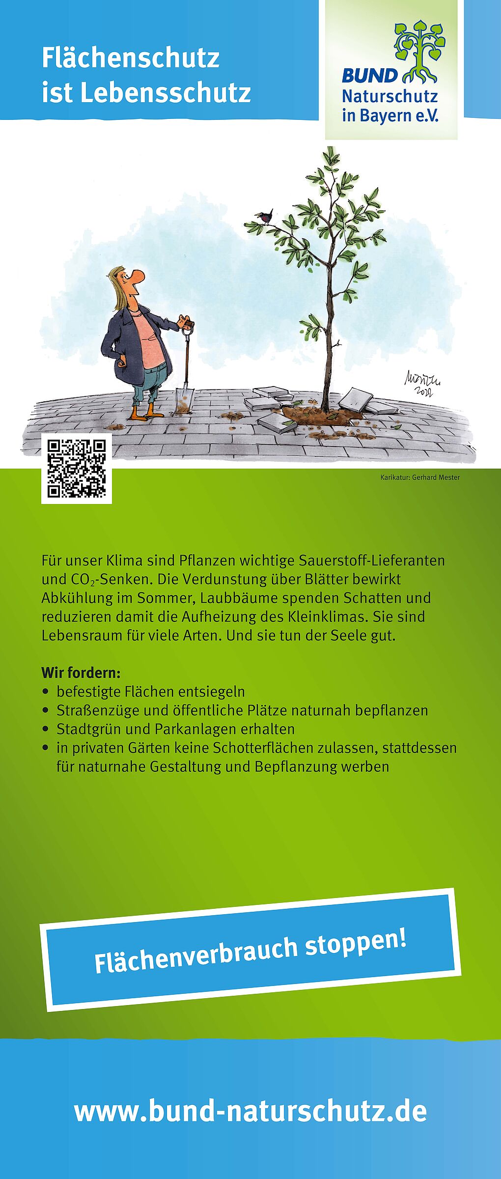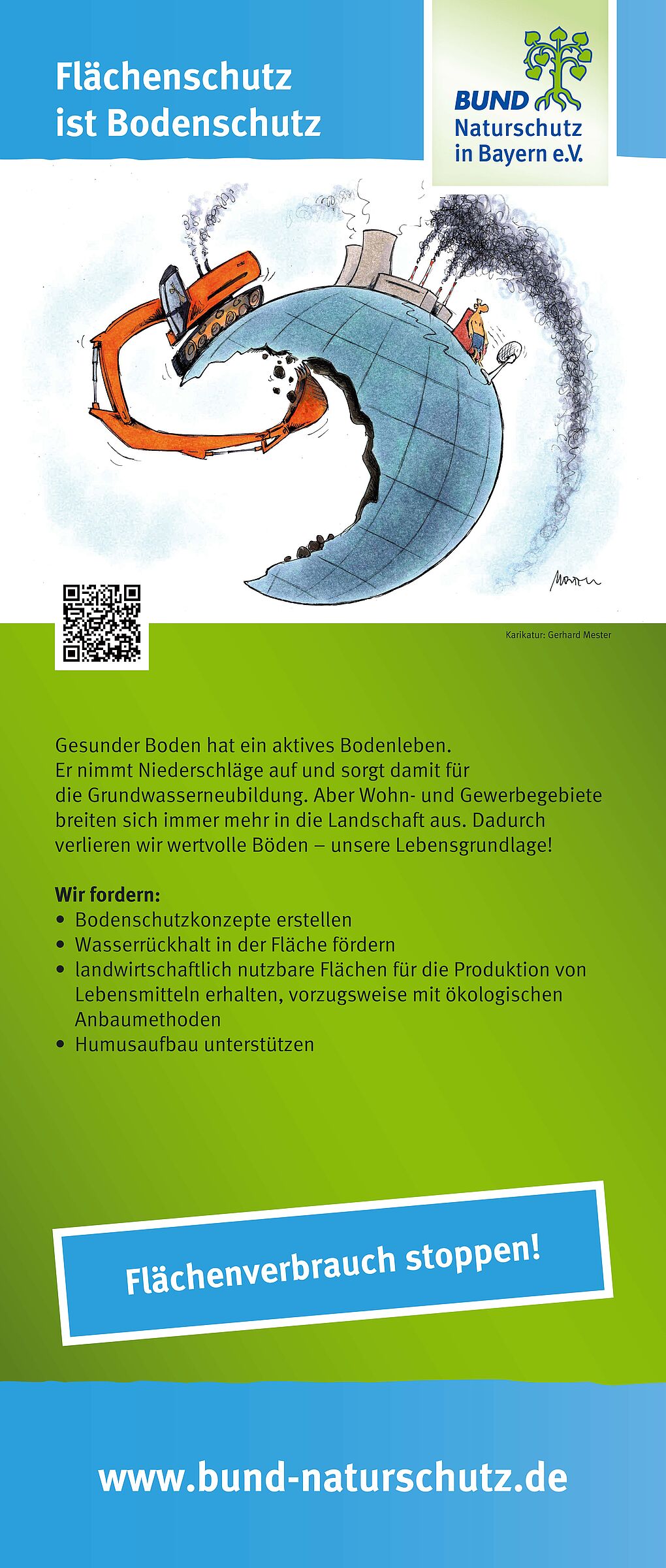 ‚Flächenschutz‘, ein Begriff der so viel vereint: Ein gesunder Boden nimmt Niederschläge auf, ist Lebensraum für viele zahlreiche Lebensformen, ist CO2 Speicher und bewahrt die landschaftlichen Besonderheiten. Wachrüttelnde Karikaturen von Gerhard Mester auf den acht Roll-ups überspitzen das Thema gekonnt und regen zum Nachdenken an. Mit gezielten Forderungen und Lösungsansätzen taucht der Betrachter tiefer in die Thematik ein und kann sich über einen QR-Code auf dem Handy mit weiterem Hintergrundwissen versorgen.
