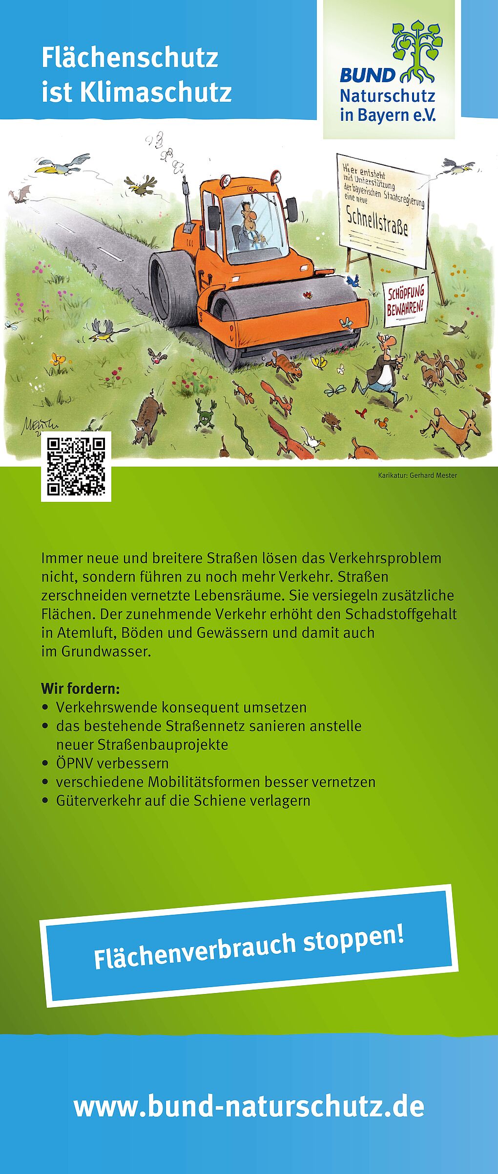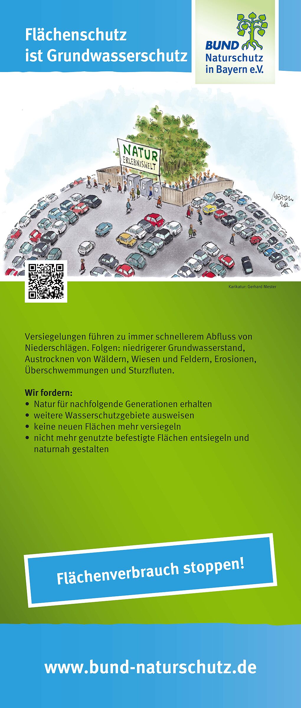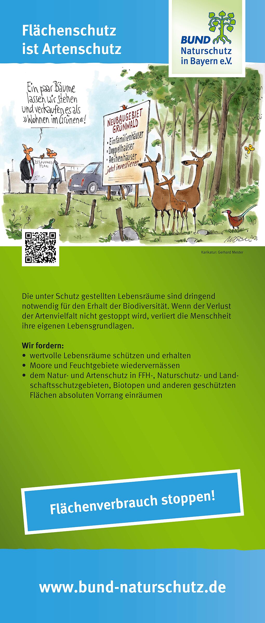 ‚Flächenschutz‘, ein Begriff der so viel vereint: Ein gesunder Boden nimmt Niederschläge auf, ist Lebensraum für viele zahlreiche Lebensformen, ist CO2 Speicher und bewahrt die landschaftlichen Besonderheiten. Wachrüttelnde Karikaturen von Gerhard Mester auf den acht Roll-ups überspitzen das Thema gekonnt und regen zum Nachdenken an. Mit gezielten Forderungen und Lösungsansätzen taucht der Betrachter tiefer in die Thematik ein und kann sich über einen QR-Code auf dem Handy mit weiterem Hintergrundwissen versorgen.