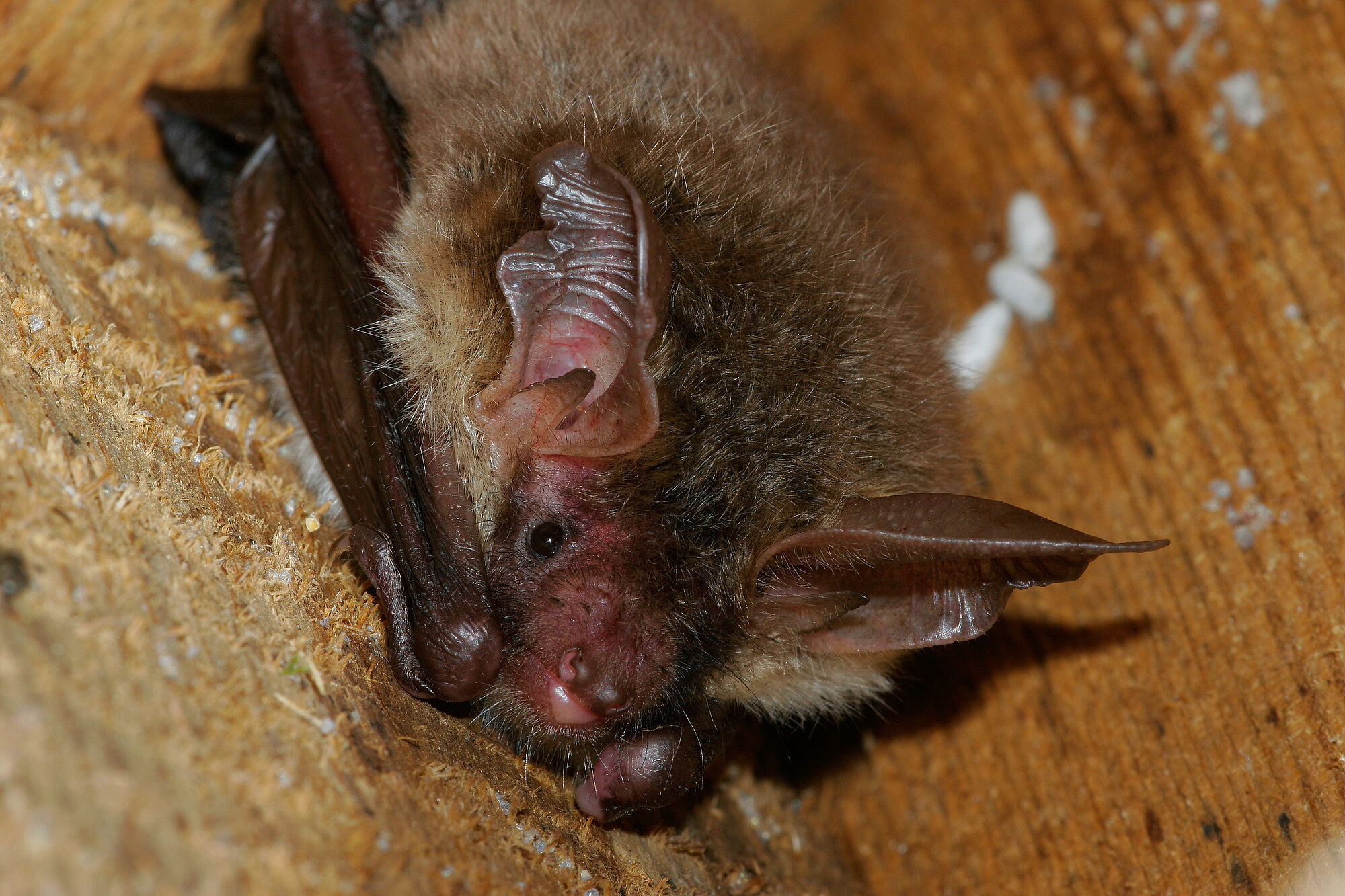 Viele Fledermausarten nutzen Eichenwälder als Lebensraum, Quartier- und Jagdgebiet. Alle heimischen 22 Arten kommen in Wäldern vor. Die Verbreitung der Fledermäuse im Wald ist nur unzureichend bekannt, weil in vielen Waldgebieten gar keine Erfassung durchgeführt wurde. So wurde z.B. die Nymphenfledermaus (Abb.1) jahrzehntelang übersehen, weil sie überwiegend im Kronenraum lebt. Besonders bedroht durch die Gifteinsätze ist auch die gefährdete FFH-Art Bechsteinfledermaus, weil die Raupen, die deren Hauptnahrungsquelle darstellen, durch die Begiftung vernichtet werden (Abb.2).