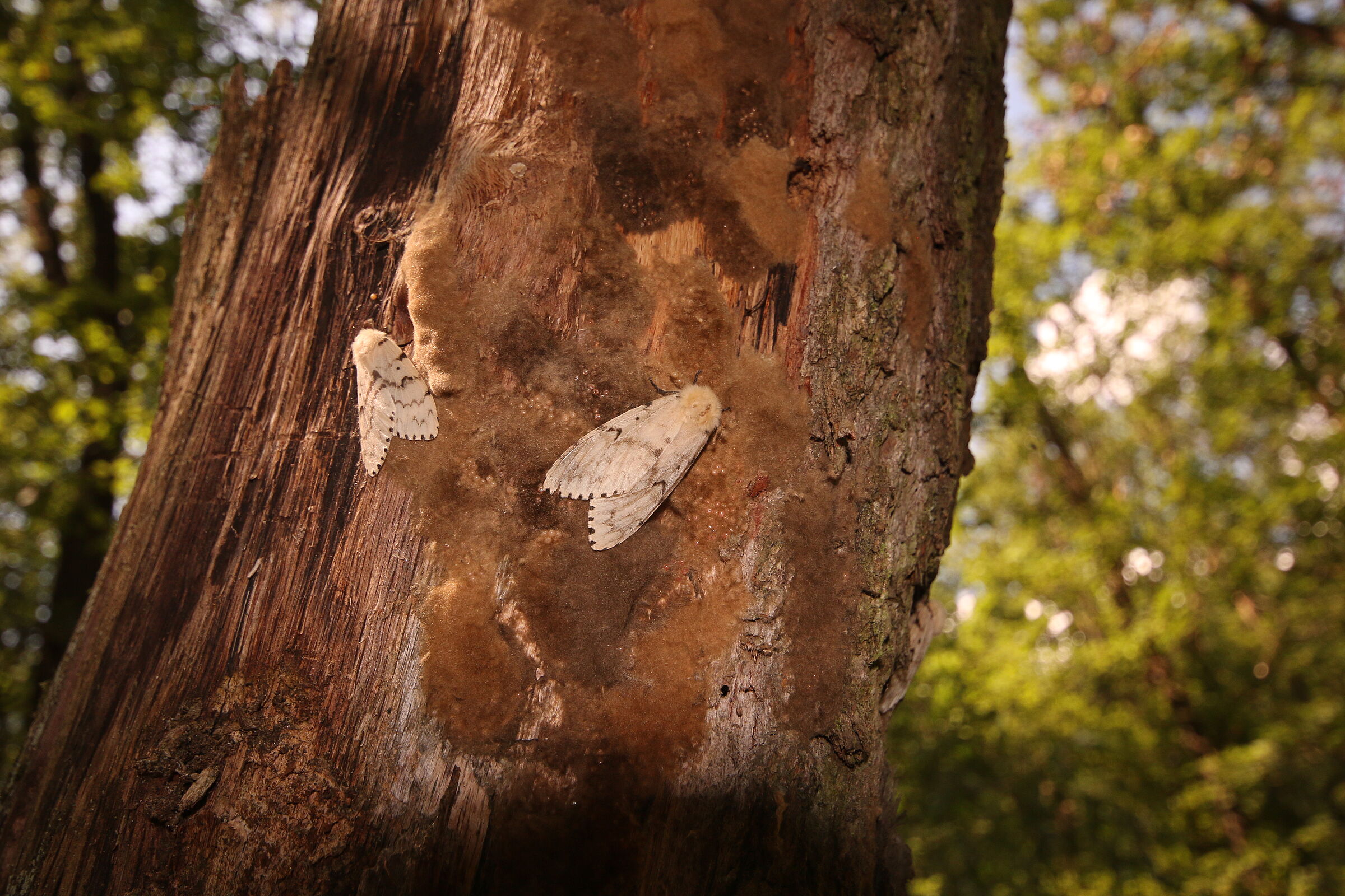 Nach der Verpuppung schlüpfen die Falter (Abb. 11) zwischen Juli und Ende September. Nach der Begattung legt das Weibchen einige Hundert Eier in einem Gelege ab und umhüllt es mit gelblicher Afterwolle zum Schutz gegen die Winterkälte. Dieses schwammige Gebilde hat dem Schwammspinner seinen Namen gegeben (Abb. 11).