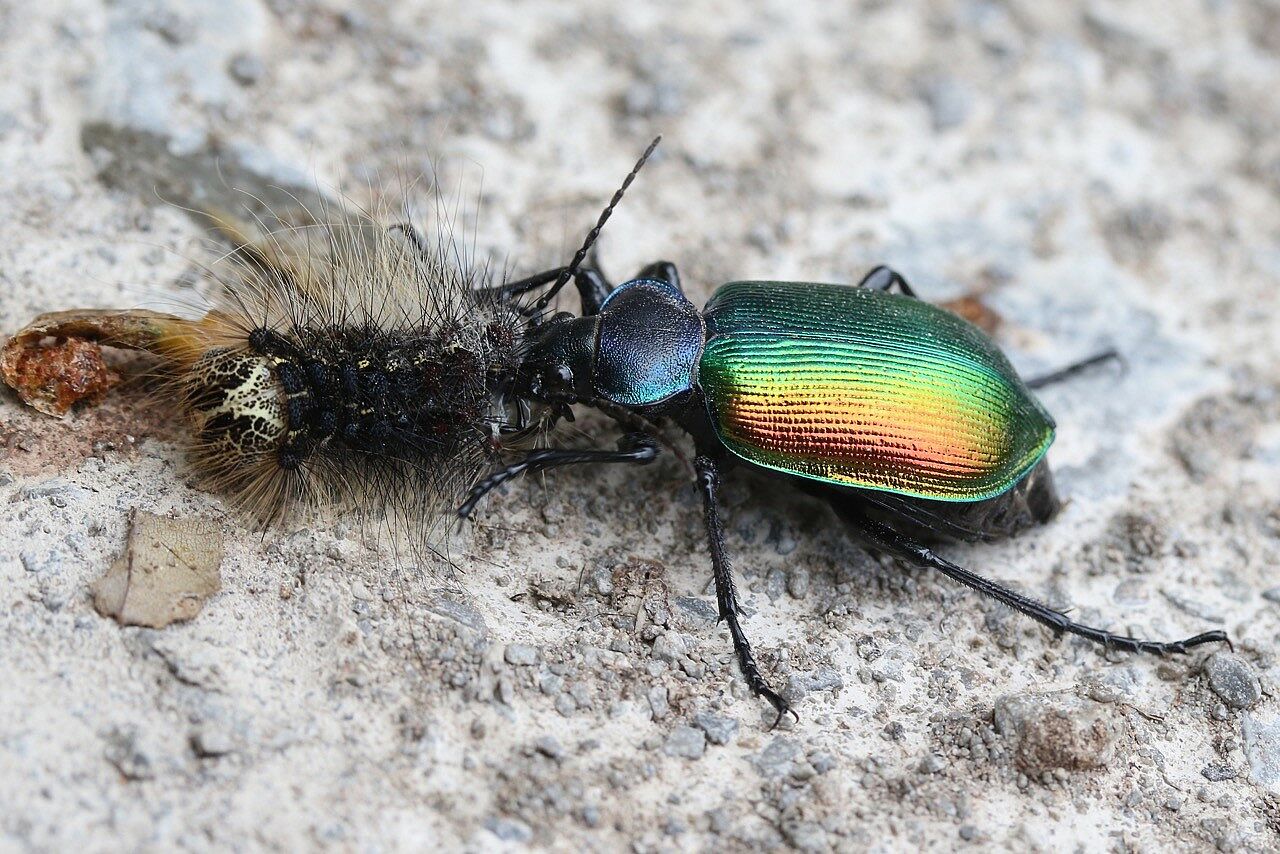 Die BN-Kreisgruppe Bad Kissingen hat 2020 diesen Prozess begleitet und den Zusammenbruch der Schwammspinner-Population durch Parasiten und räuberische Käfer dokumentiert. So wurde der ansonsten in Bayern vom Aussterben bedrohte schillernde Große Puppenräuber (Abb. rechts) wohl erstmalig in der Region nachgewiesen - ausgelöst durch das große Nahrungsangebot. Der Käfer wird mehrere Jahre alt und frisst in einer Saison etwa 400 Raupen. Auch seine Larven sind sehr gefrässig und entwickeln sich schnell.