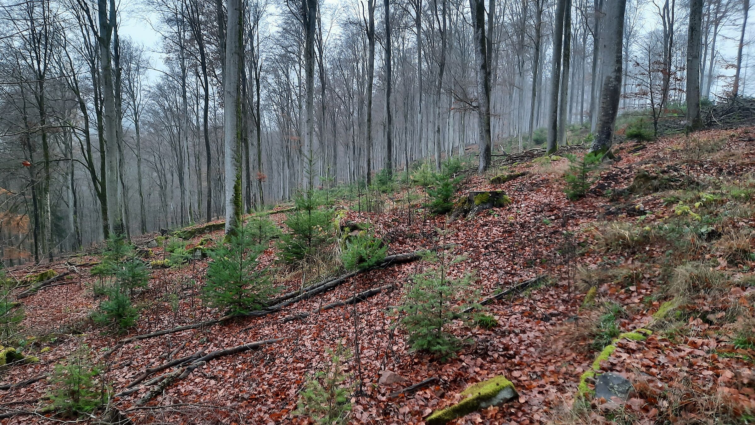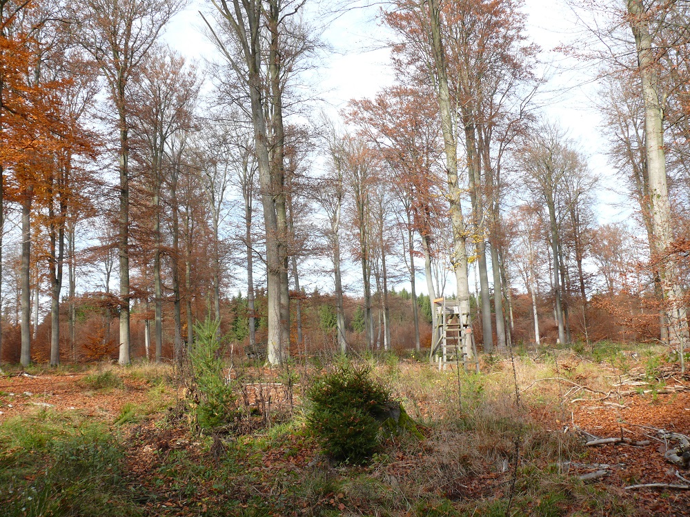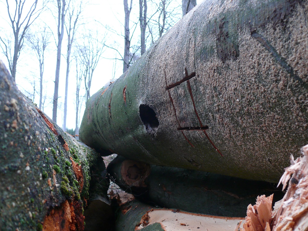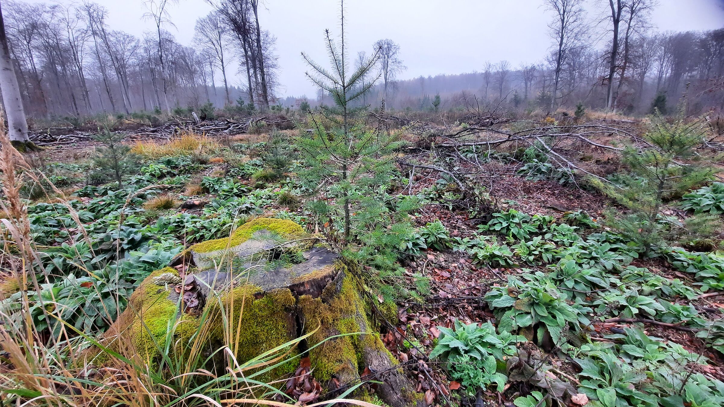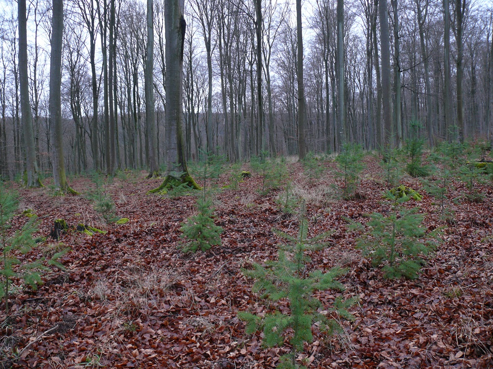 In den vergangenen 6 - 8 Jahren wurden hektarweise alte Buchenwälder gefällt und Kahlschläge erzeugt, auf denen nun standortfremde Douglasien flächendeckend ausgepflanzt werden.