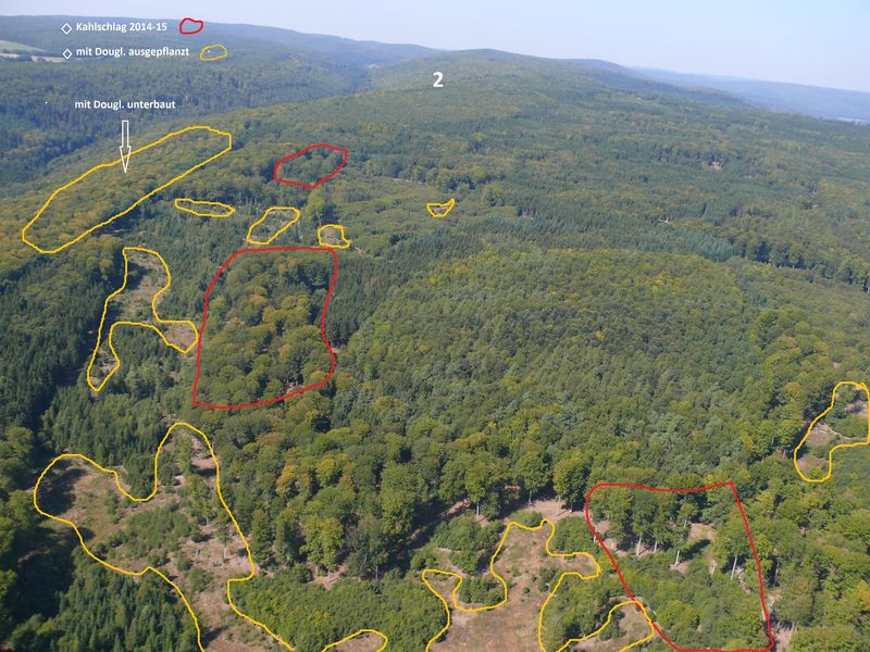 Die gerodeten Waldflächen haben inzwischen eine Größenordnung von ca. 100 Hektar erreicht. Weitere 46 Hektar Buchenwald sind mit Douglasien bereits unterbaut und stehen zur Fällung an (siehe Luftbilder unten). Schon vorhandene Buchennaturverjüngung wird innerhalb der Kulturflächen systematisch bekämpft, um Platz für Douglasien zu schaffen.